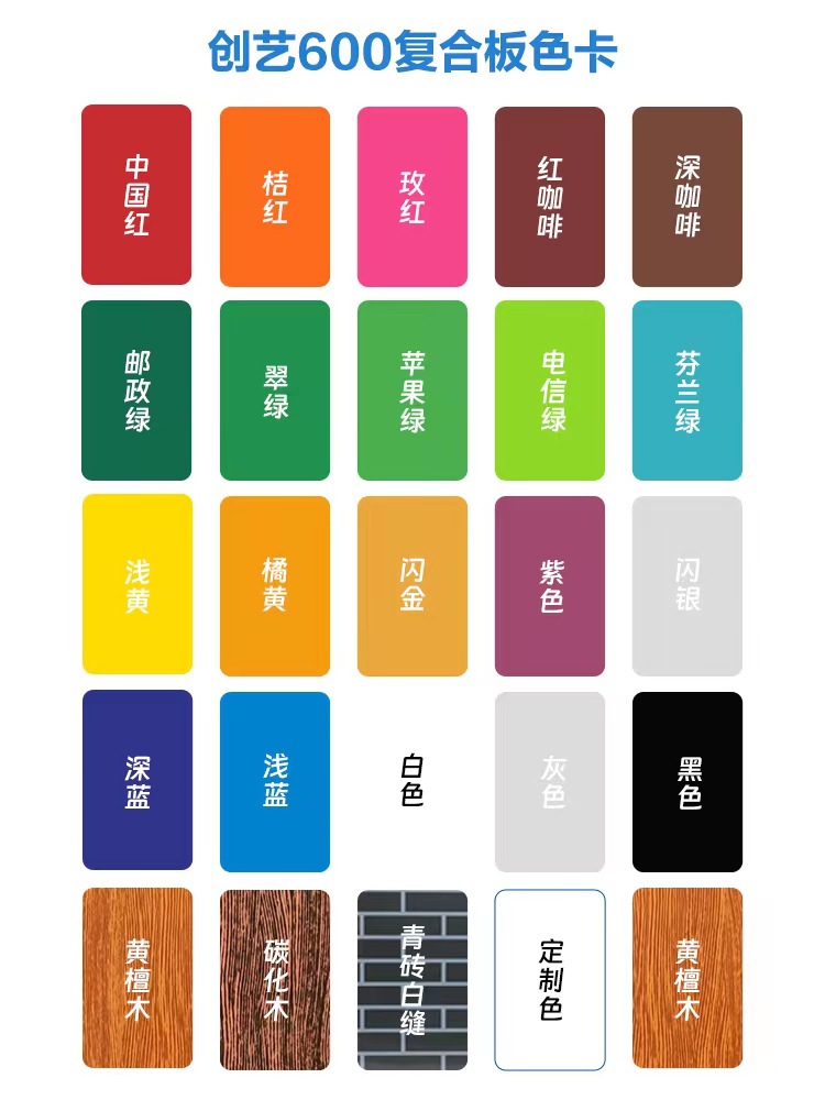 颜色中华红,白色,黑色,灰色,浅黄,桔黄,桔红,深蓝,浅蓝,深咖啡,红咖啡,电信绿,苹果绿,翠绿,邮政绿,玫红,紫色,芬兰绿,黄檀木,碳化木,青砖白缝