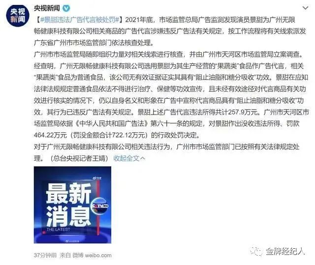 5月28日,央视新闻报道了广州市市场监管部门对于演员景甜违法广告代言的行政处罚,根据该处罚,景甜所代言的产品为“果蔬类”普通食品,却声称有“阻止油脂和糖分吸收”的功效,最终市场监管部门依《广告法》第六十一条对景甜作出没收违法所得及罚款共计722.12万元的决定。