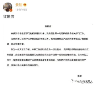 虽然已经公开的行政处罚中并未明确点名适用的是《广告法》第六十一条哪一款,但根据处罚中“无有效证据证实”“应知”“未经核实”等字眼,景甜大概率是触碰了虚假广告的红线。目前,景甜已公开回应并致歉,承认在合同签订过程中未尽到充分审查义务,对相关产品的消费者造成了负面影响。