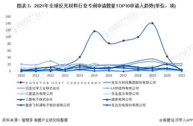 2)全球反光材料行业TOP10专利申请人:КОЧЕТОВ ОЛЕГ САВЕЛЬЕВИЧ夺得桂冠