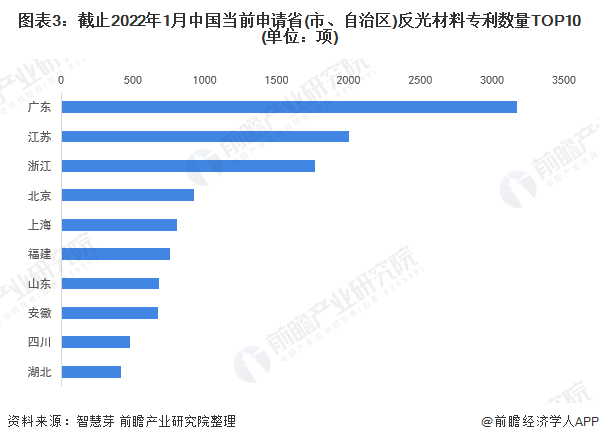 3)中国反光材料行业区域专利申请分布:广东专利申请数量最多