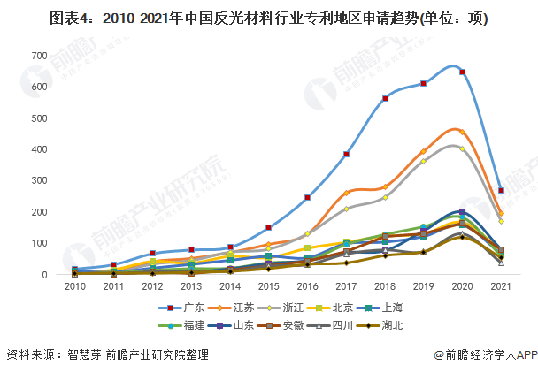 趋势方面,2010-2021年期间,广东反光材料专利申请量位居榜首,2015年后,广东逐渐拉开与江苏的距离,并一直位居榜首。专利地区申请次多地区分别为浙江、北京与上海。