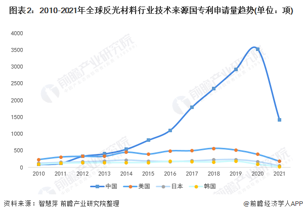 从趋势上看,2010-2021年,中国反光材料专利申请数量遥遥领先。2021年,中国反光材料专利申请量为1421项,美国反光材料专利申请量为183项。