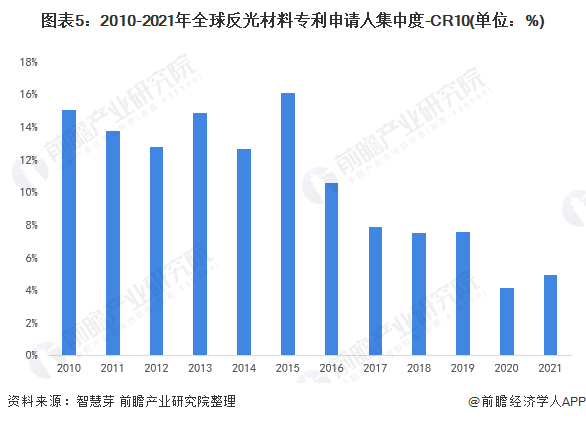 ——全球反光材料行业专利申请人集中度:市场集中度不高,CR10波动下降