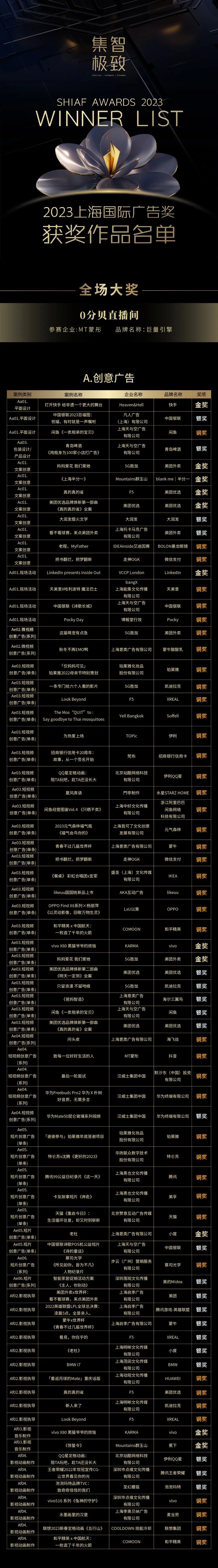 8月11日,2023上海国际广告奖于上海市普陀区环球港凯悦酒店举行颁奖盛典,共诞生325个等级奖项,包含1个全场大奖、28个金奖、92个银奖、204个铜奖。