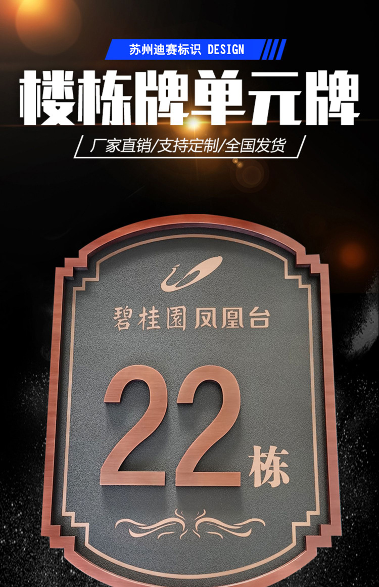 本网页所展示的有关【不锈钢高档小区楼栋楼层牌门牌房地产楼号牌标识牌数字单元牌制作_交通标识标牌_苏州迪赛标识有限公司】的信息/图片/参数等由广告界的会员【苏州迪赛标识有限公司】提供,由广告界会员【苏州迪赛标识有限公司】自行对信息/图片/参数等的真实性、准确性和合法性负责,本平台(本网站)仅提供展示服务,请谨慎交易,因交易而产生的法律关系及法律纠纷由您自行协商解决,本平台(本网站)对此不承担任何责任。您在本网页可以浏览【不锈钢高档小区楼栋楼层牌门牌房地产楼号牌标识牌数字单元牌制作_交通标识标牌_苏州迪赛标识有限公司】有关的信息/图片/价格等及提供【不锈钢高档小区楼栋楼层牌门牌房地产楼号牌标识牌数字单元牌制作_交通标识标牌_苏州迪赛标识有限公司】的商家公司简介、联系方式等信息。